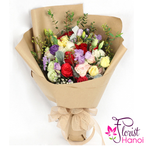 The beautiful mixed flowers bouquet is a stunning gift to send for birthday, anniversary or to say get well. Arranged with fresh flowers including red roses, pink roses, purple roses and purple wax flowers. Created by a local florist and decorated with a pink ribbon. The mixed bouquet is available for same day delivery.