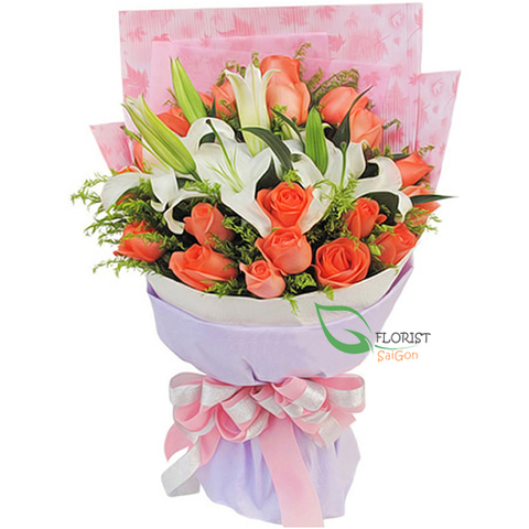 | Kind of flowers | White lilies, orange roses |