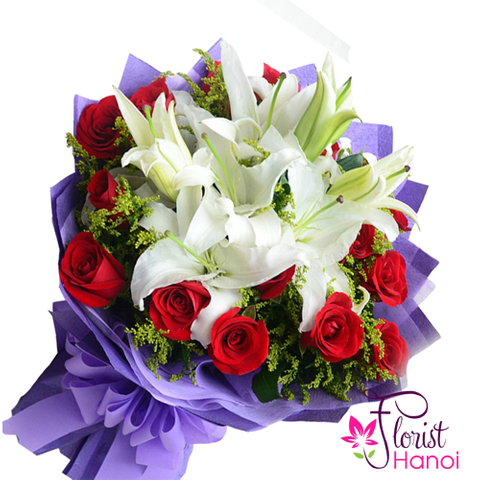 Add some romance with this rich bouquet of luxurious red roses and white lilies.