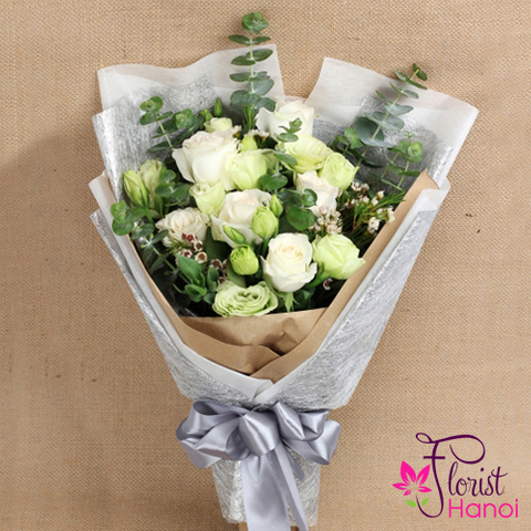 Cream colored roses and lisianthus wrapped with a layer of kraff paper and silvery wrap to produce a beautiful modern effect.