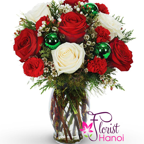 White roses, red roses, red mini carnations and white waxflowers are complemented by vivid Christmas ornaments and a clear vase in this arrangement that conveys the merry sentiments of the season in a traditional yet memorable way.