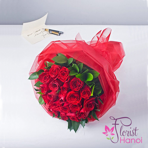 First impression bouquet of 30 red roses covered with red paper for your Valentine. What better way to let someone know about your love than with flowers? What flower would be better for purpose than red roses? 30 gorgeous red roses are wappred in matching red paper and when handed over to the woman of your life, will not leave any doubt about your feelings. Send it across when you want to ask her for a first date or even before the 100th, just to see that heartbeat skipping smile. Wait for her to call you, for she surely will once she receives this beauty.