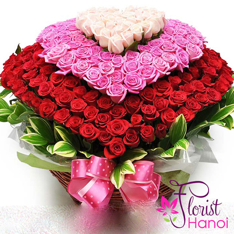 The basket of 365 roses with red, dark pink, light pink. The flower basket is heart-shaped, delicate and delicate. It is very happy to feel the fullness of his feelings for him. The flower basket is also called Lifetime together, a special flower basket specially designed for one and only one person, showing the loyalty and longevity of the giver.