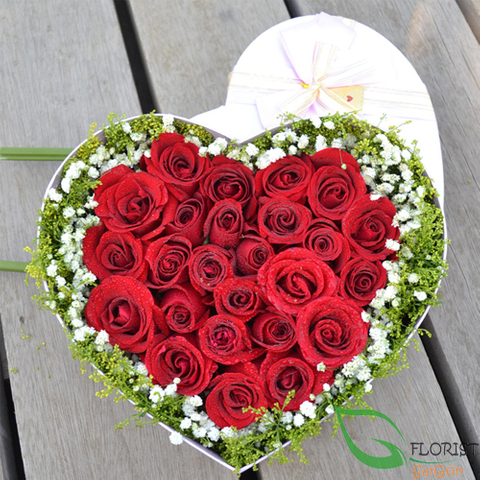 Heart flowers box from red roses and baby breath