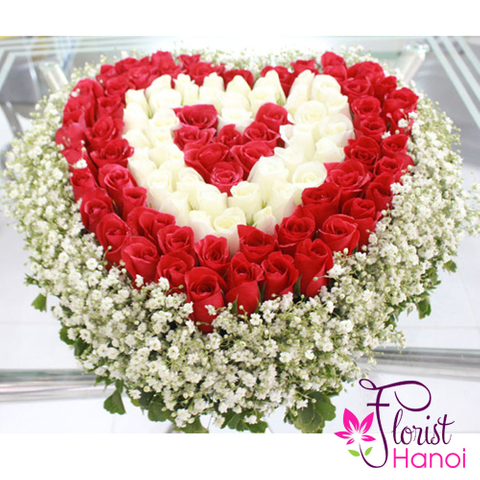 There are a number of ways to show that special person in your life how much you care, but we personally think roses are the best option! Take it a step further by choosing our heart of roses arrangement in red and white for an especially romantic message. Our beautiful roses and baby breath are artfully arranged into a heart shape, perfect gift for Valentine’s day, birthday, anniversary…