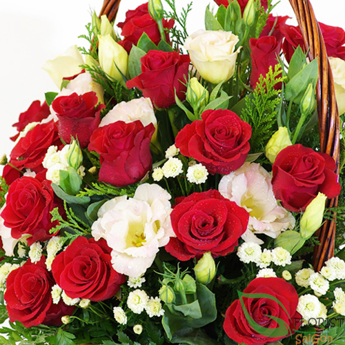 An incredibly elegant flower basket arrangement. Red roses, lisianthus, white calimero with seasonal green in a basket. Send this arrangement to your Mom, your wife on birthday, mother’s day…