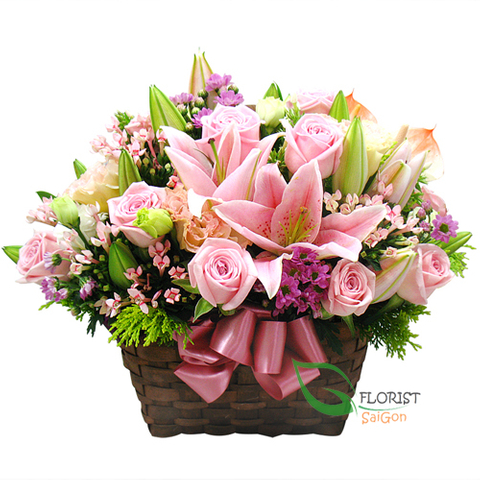 | Kind of flowers | Pink roses, pink lilies, wax flowers |