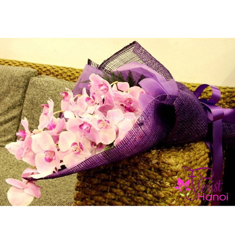 A magnificent handbouquet that effuses such warmth and rapture. Splendid Cymbidiums ascend delicately intertwined with petite leaves. This is a gift to express great love, affection or happiness, when mere words do not suffice.