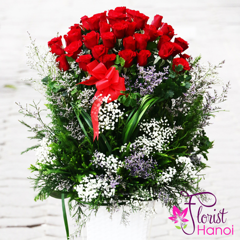 A new design basket of red roses with baby breath and ribbon. Red roses can never fail to make an impression on someone you love or someone you are trying to impress. Now what if you get your hands on a unique arrangement of red roses. When everything else fails, try to show your lvoe through this simple yet unique arrangement say it with flowers, say it in the best possible way.
