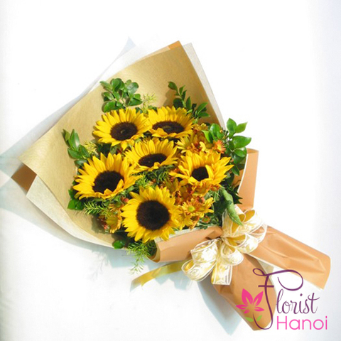 This bouquet of 10 sunflowers will be a good choice when you want to cheer up your beloved women or man and wish them goodluck and optimism. A bouquet of 10 sunflowers will be wrapped in special craft paper and decorated with a ribbon. A seansonal green filler will be added to the bouquet to add brightness and decorative value. Any sunflower bouquet includes a small greeting card with your name and a message for the recipient.