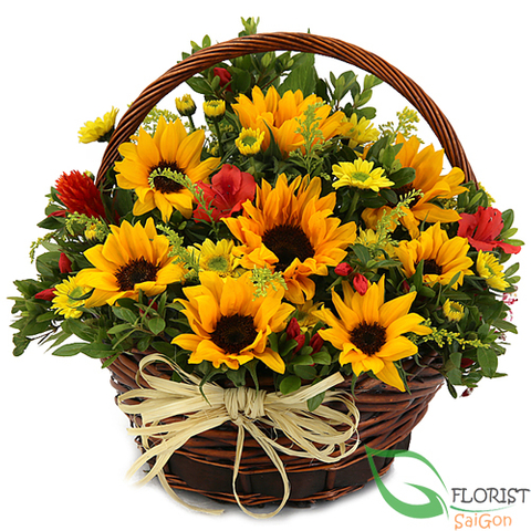 That’s just it a beautiful arrangement of simple stunning cheerful sunflowers accompanied with complimentary foliage. Order this beautiful basket of sunflowers for somebody special.